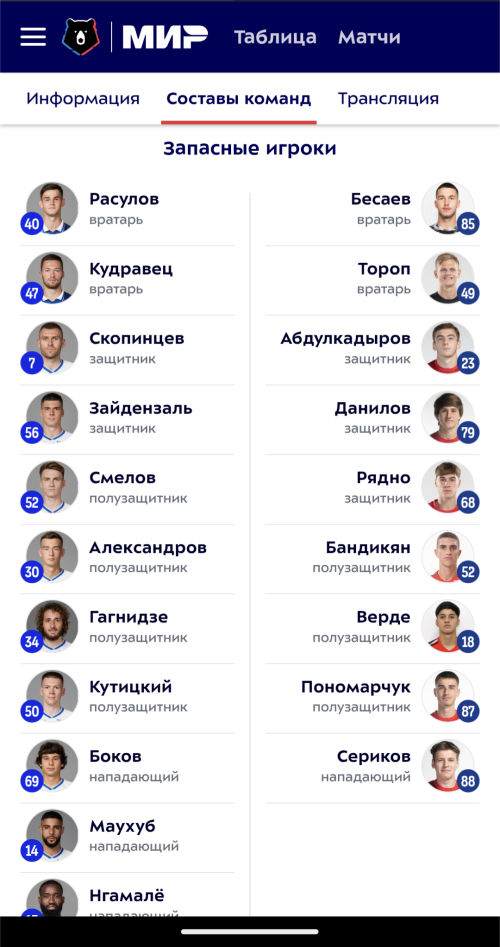 • SofaScore — Морозов (7,5), Батраков (7,4) и Монтес (7,3). Самый низкий балл у Комличенко и Руденко (6,3).