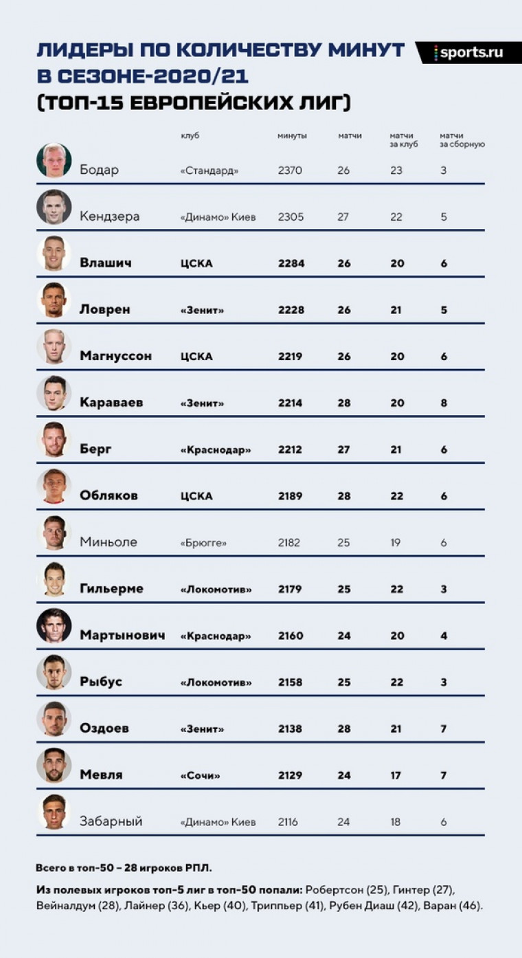 В результате список игроков, отыгравших наибольшее количество минут в сезоне-2020/21, переполнен футболистами РПЛ.