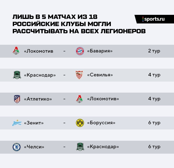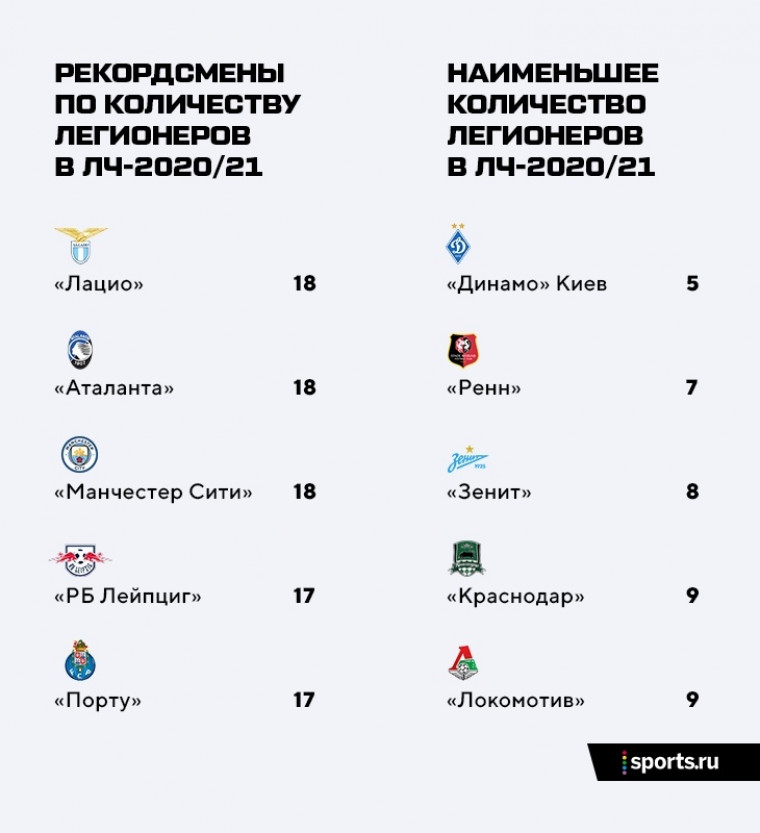 С соперниками наших клубов тоже все понятно: «Лацио» – 18, «Челси» и «Боруссия» – по 16, «Бавария» – 15, «Брюгге» и «Севилья» – по 14, «Зальцбург» и «Атлетико» – по 13. Исключение – «Ренн», который вообще занял 31-е место по числу иностранцев, опередив лишь киевское «Динамо».