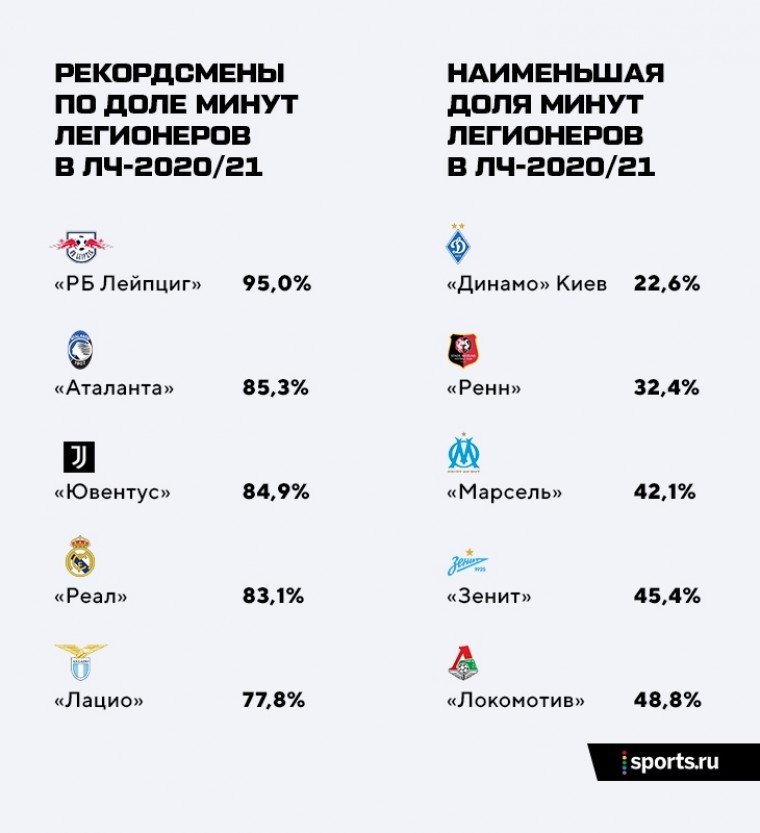 Конечно, важно не только число легионеров (среди наших клубов по качеству есть вопросы к «Локомотиву»), но и количество минут, сыгранных ими. По этому показателю «Зенит» и «Локомотив» тоже среди самых скромных команд Лиги чемпионов.