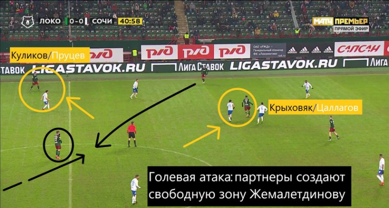 В игре с «Сочи» Крыховяк и Куликов своими движениями убирали из центра опорников «Сочи» Пруцева и Цаллагова, чтобы создать свободу для Жемалетдинова. Получилось открыть счет.