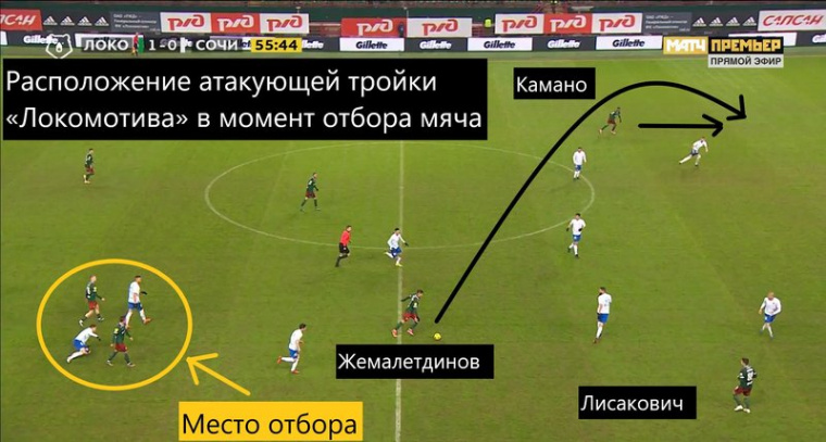 Особенность атакующего трио — ворваться к воротам по центру может любой игрок. В конце игры с «Арсеналом» Смолов и Камано оставили эту зону для Жемалетдинова. Есть взаимозаменяемость.