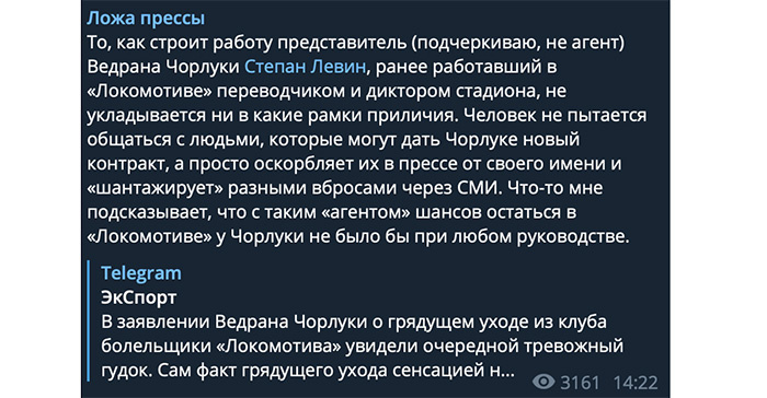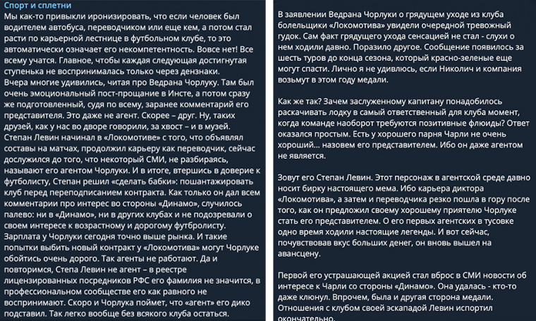 Что произошло дальше? Чорлука объявил о своём уходе из клуба по окончании сезона, а сразу в трёх телеграм-каналах появились посты про его агента Степана Левина с очень схожей риторикой. Никаких выводов — просто факты.
