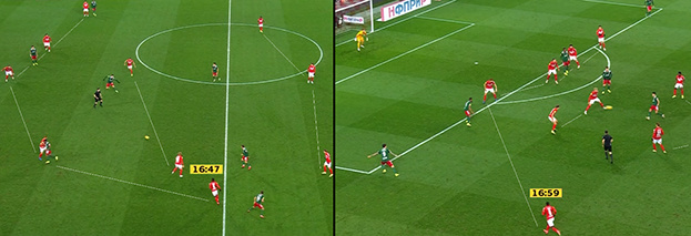 Гол «Локомотива» пришел как раз из-за проблемы Мозеса — Ненахова. Вот как это было. Гости перегружают правый фланг обороны «Спартака» и оказываются там в численном большинстве. Мозес выдвигается на Ненахова, тот отдает передачу на Камано. Смолов, ушедший в край, связывает Кофрие. Литвинов играет по Жемалетдинову, который грамотно уводит за собой полузащитника красно-белых, освобождая для партнера коридор для движения в середину. Литвинов оставляет оппонента Кутепову и выдвигается на Камано, но слишком поздно. Джикия не смещается (как и в прошлой игре с «Лестером») ближе к активному флангу, из-за чего проходит передача, которая проходить не должна. Финал серии ошибок — отсутствие концентрации от Айртона, который полностью пропустил включение Керка.