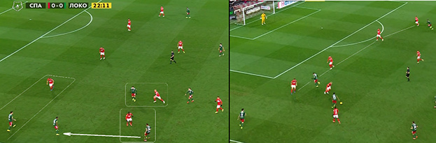 Например, Кофрие с мячом, его никто не прессингует — значит, у хозяев есть время, чтобы расставиться и осуществить какие-то задумки. Первым себя предлагает Игнатов, забегая за спины защитникам. Но там почти нет пространства, хотя за счет активности Игнатов создает зону для включения Мозеса, если до того доставят мяч. Второй вариант — это огромнейший коридор для паса на Соболева, но Александр не предлагает себя, и это регулярная проблема форварда. В итоге выбран третий вариант: через игру на третьего Литвинов доставляет мяч на Мозеса, где красно-белые пытаются в статике обыграть соперника, теряют мяч — и Литвинова удаляют.