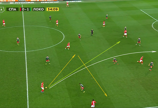 Структурно двух игроков «Спартака» элементарно не хватает на всю ширину поля для нормальных открываний. Они успевают предложить себя только в отсутствии высокого прессинга от соперника. Именно с этим связано такое большое количество длинных передач на Соболева в борьбу.