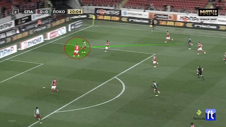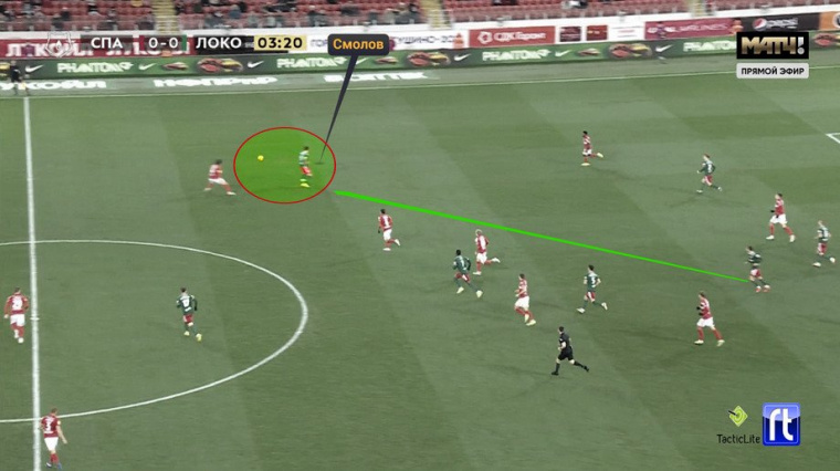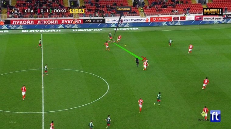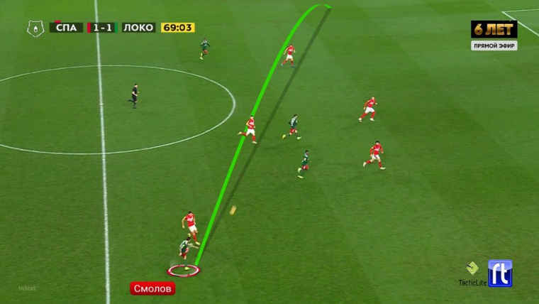 Смолов допускает слишком высокий брак при построении атак, причём не только в сложных эпизодах. Вот, к примеру, «Локомотив» совершил перехват, идёт длинная передача в сторону Смолова — мяч на удобной высоте, Джикия не успевает оказать давление. Фёдор плохой обработкой сводит вероятность контратаки к нулю.