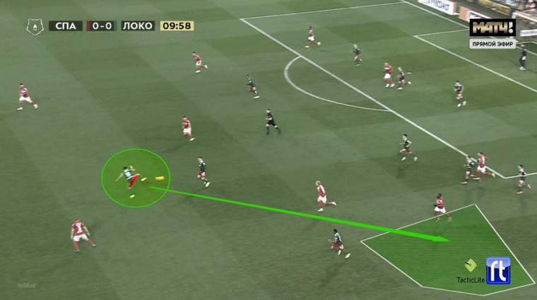 И в целом манера игры Смолова — она именно такая, не подразумевающая большого объёма единоборств. Он больше любит уходить в свободные зоны ближе к флангам или в глубину (в матче со «Спартаком», например, перегружал бровку Кофрие и пытался пользоваться недоработками Мозеса), тогда как агрессивная плотность доставляет ему дискомфорт. В «Краснодаре», кстати, объём у Смолова был значительно выше.