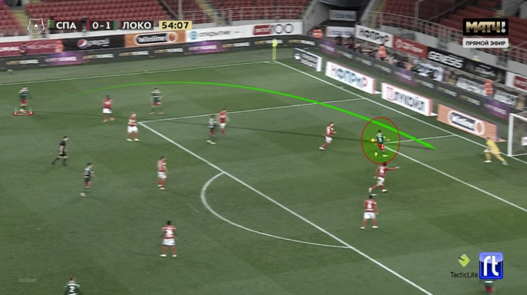 А здесь Смолов зачем-то начал изобретать игру пяткой в центре поля (к слову, не единственный раз в этом матче) — и вместо выбега в быструю атаку отправил мяч обратно в зону Мозеса. «Спартак» получил возможность для второй волны позиционного наступления.
