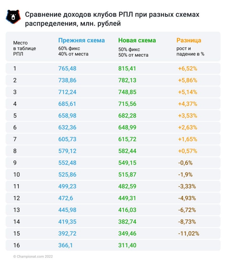 Выходит, что первое место получит 815 млн, а последнее — 316 млн рублей. В прошлом сезоне (напоминаем — схема была 60 на 40) суммы были меньше в среднем на 328,5%!