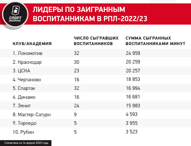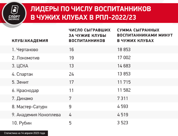 Усиленно поставляют кадры соперникам и две другие крупные московские школы — «Спартак» и «Локомотив». Интересно, что в прошлом сезоне по этому показателю с отрывом лидировали красно-зеленые, но сейчас на первом месте Академия имени Федора Черенкова. Сразу 13 команд РПЛ в этом сезоне выпускали на поле хотя бы одного выпускника «Спартака». Помимо самих красно-белых, чаще остальных это делали «Химки» — шесть футболистов.
