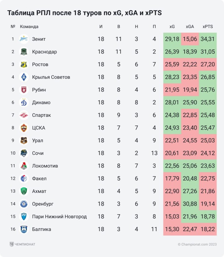 Как итог, если сравнивать реальную таблицу с той, что зависела бы исключительно от голевых моментов, при своих остались ЦСКА, «Ахмат» и «Оренбург». Немного ниже в реальной таблице РПЛ находятся «Зенит», «Крылья Советов» и «Рубин», слегка выше — «Краснодар», «Спартак», «Факел» и «Балтика». Огромный скачок в активе «Динамо», «Локомотива» и «Пари НН», а конкретно недобрали очков «Ростов», «Урал» и особенно «Сочи».