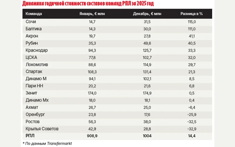 Самый большой прирост трансферной стоимости продемонстрировали «Балтика» и «Сочи» — 110,9% и 115% соответственно. Это привычная история для команд, получивших повышение в классе. Transfermarkt традиционно увеличивает ценники футболистам, вышедшим в элитный дивизион. К тому же южане и калининградцы хорошо закупились после возвращения в РПЛ.