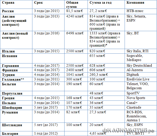 Так выглядит сравнительный рейтинг сумм, получаемых за права на трансляции в год.