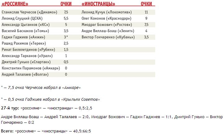 Очередной тур — очередные удары по отечественной тренерской школе. Сравните вот хотя бы две цитаты. Дмитрий Гунько: «[О первом голе Ивелина Попова.] Естественно, то психологическое состояние, в котором сейчас находится команда, не позволило нам вынести удар… Есть понятие чести и достоинства, но до игроков достучаться очень сложно». Виктор Гончаренко: «Какая мотивация у игроков на последние матчи? Все профессионалы. Самое плохое для нас будет, если станут писать, что мы бросили играть». Вам понятно, почему немотивированная «Кубань» обыгрывает немотивированный «Спартак», а не наоборот? «Анжи» Гаджи Гаджиева не удалось победить «Ростов» Миодрага Божовича, несмотря на полчаса игры в большинстве. Остается надеяться, что хоть Андрею Талалаеву пригодятся тактические разборы по его же «Волге», подготовленные тренерским штабом Андре Виллаш-Боаша.