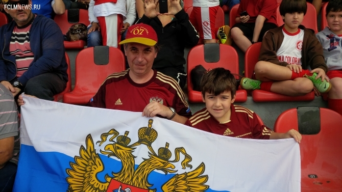 Но в секторе с российскими флагами поддерживают Дзагоева, Денисова, Березуцкого. Заводящий явно знаком со сборной лучше остальных. Неудивительно - это люди из российского консульства в Сан-Паулу.