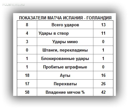 И вновь мы отвлеклись. Голландцы своими точными ударами попросту затерроризировали Касильяса – в цель попали 11 попыток из 13. В результате испанский голкипер совершил грубейшую ошибку, после которой был забит четвертый мяч. Его же партнеры били и реже, и далеко не так точно – всего 4 попадания из 8.