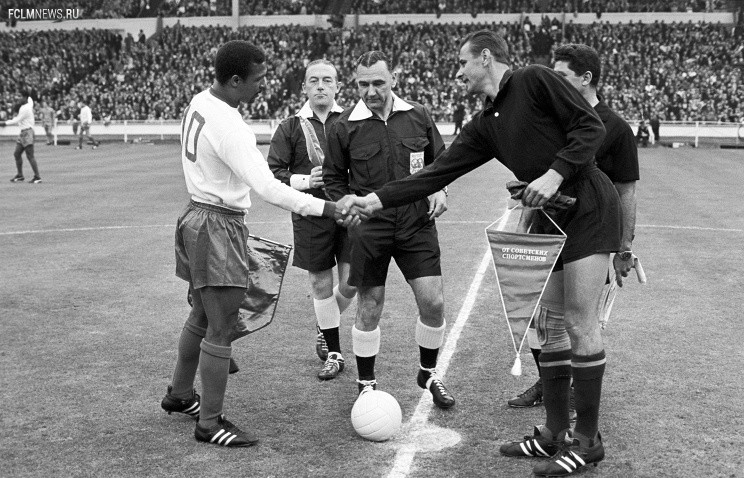 Капитан сборной СССР Лев Яшин (справа) и капитан сборной Португалии Мариу Колуна перед началом матча во время ЧМ-1966 в АнглииЧемпионат мира-1966 в Англии