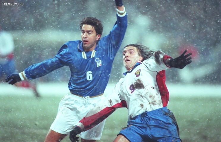 Защитник Алессандро Костакурта (слева) и нападающий Сергей Юран в матче между сборными России и Италии за путевку на ЧМ-1998 во Франции (1:1)Чемпионат мира-1998 во Франции