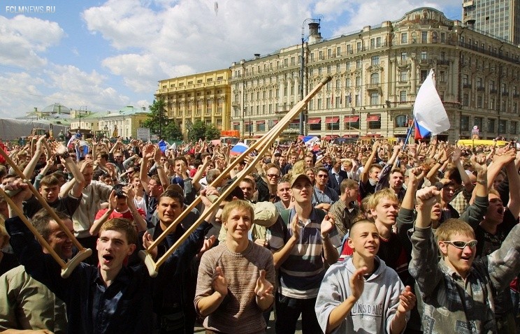 Российские болельщики в Москве во время матча между сборными России и Туниса на ЧМ-2002 (2:0)Чемпионат мира-2002 в Японии и Южной Корее
