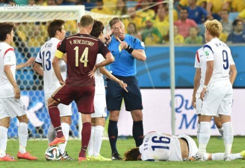 Уже на 13-й минуте он продемонстрировал, что не будет снисходителен к таким приемам, как атака соперника сзади, и показал Сон Хын Мину желтую карточку за грубый подкат под Самедова, а на 20-й минуте – Ки Сон Енму за опасный прыжок в ноги все тому же Самедову. На 49-й минуте заработал горчичник и Шатов – за грубую атаку Ку Джа Чхоля, а сам этот кореец получил карточку на 90-й минуте за срыв атаки сборной России, с чем я тоже полностью согласен. Кстати, на 61-й минуте за такое же нарушение Питане следовало наказать и нашего Ещенко, но он этого не сделал.