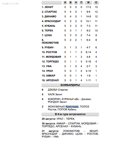 "Краснодар" остался единственной командой, пропустившей лишь один мяч за 5 стартовых туров. Его ворота смог распечатать только "Урал" на своем поле (1:1).
