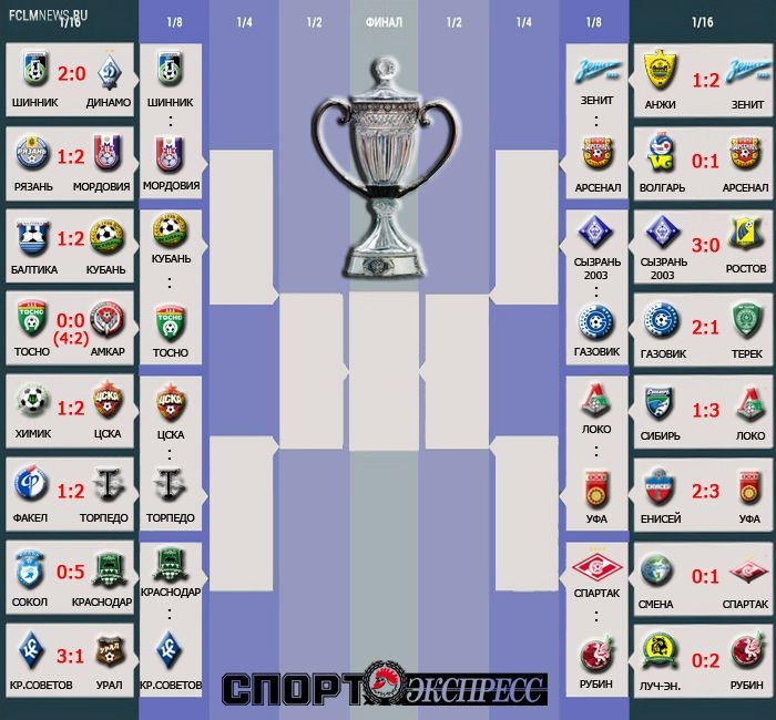 "Сибирь" – "Локомотив" – 1:3. "Рязань" – "Мордовия" – 1:2. "Сызрань-2003" – "Ростов" – 3:0. "Крылья Советов" – "Урал" – 3:1. "Волгарь" – "Арсенал" Т – 0:1. "Анжи" – "Зенит" – 1:2. "Балтика" – "Кубань" – 1:2. "Тосно" – "Амкар" – 0:0 д.в. Пенальти – 4:2. "Сокол" – "Краснодар" – 0:5. "Шинник" - "Динамо" - 2:0. "Факел" - "Торпедо" - 1:2 д.в..