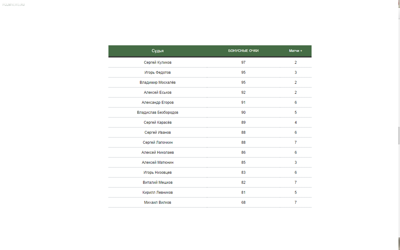 Уточнение: при подсчёте оценки работы судей к бонусным очкам в конце сезона прибавятся дополнительные баллы за количество отработанных матчей. Каждый следующий матч добавляет судье дополнительное очко, которое будет суммироваться по итогам первенства. Это сделано для поощрения частого использования лучших судей, которые получат возможность получать дополнительные вознаграждения.