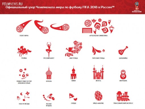 Узор состоит из следующих элементов -футбольная символика, полет мяча, тройка, жар-птица, русский балет, балалайка, купола, приветствие гостей хлебом и солью, Кижи, матрешка, мечеть, небо и звезды, сердце, лесные ягоды, Транссибирский экспресс, яйцо Фаберже.