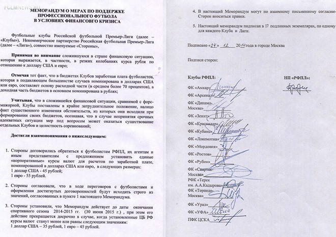 Стороны установили, что меморандум действует до даты окончания спортивного сезона 2014-2015 годов, при этом его действие прекращается досрочно в случае, когда установленные ЦБ РФ курсы валют станут менее или равны следующим значениям: 1 доллар США – 35 рублей, 1 евро – 45 рублей», — говорится в меморандуме.