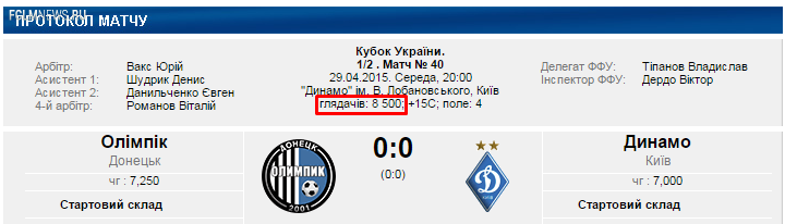 Стадион «Динамо» имени Лобановского вмещает 16 873 человека. На позавчерашнем матче 1/2 финала Кубка Украины, который был со скандалом перенесен с 1,5-тысячного стадиона имени Банникова, по официальным данным УПЛ на матче присутствовало 8 500 человек.