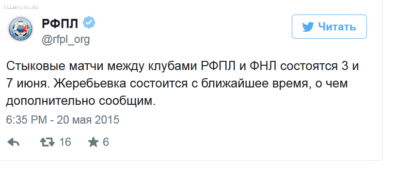 Официальный твиттер РФПЛ сообщил, что стыковые матчи между командами премьер-лиги и ФНЛ пройдут 3 и 7 июня. Напомним, что стыковые встречи проводятся между командами, занявшими 14-е и 13-е места в премьер-лиге (ими могут оказаться "Торпедо", "Арсенал", "Уфа", "Урал", "Ростов", "Амкар" и "Кубань") и занявшими 3-е и 4-е места в ФНЛ (в их число точно войдет "Томь", также могут попасть "Анжи", "Крылья Советов" или "Тосно").