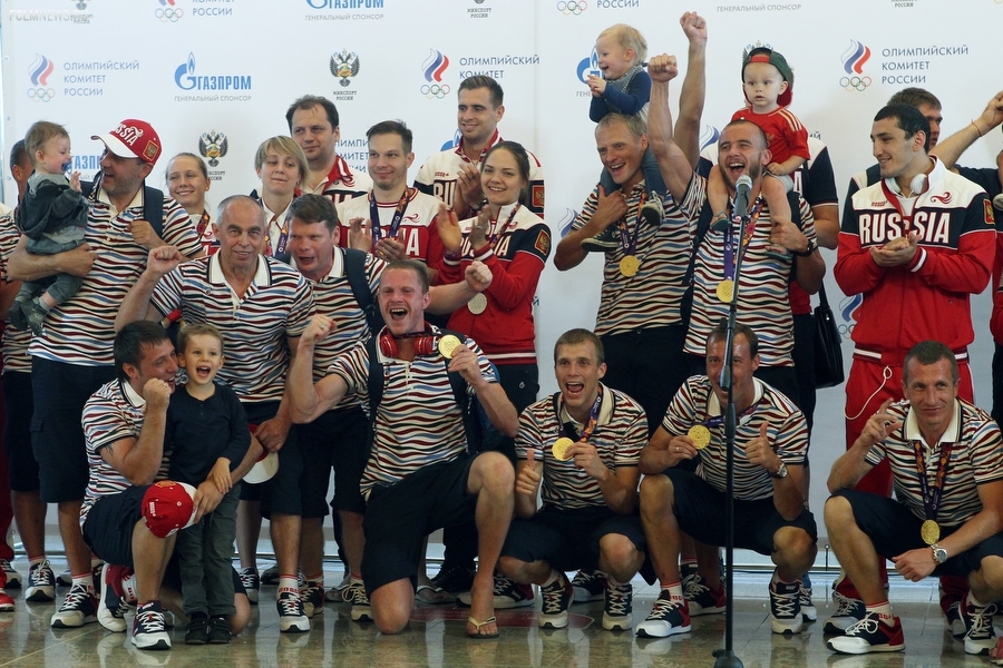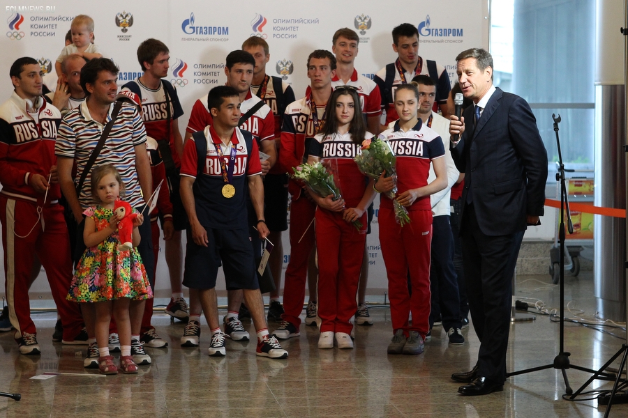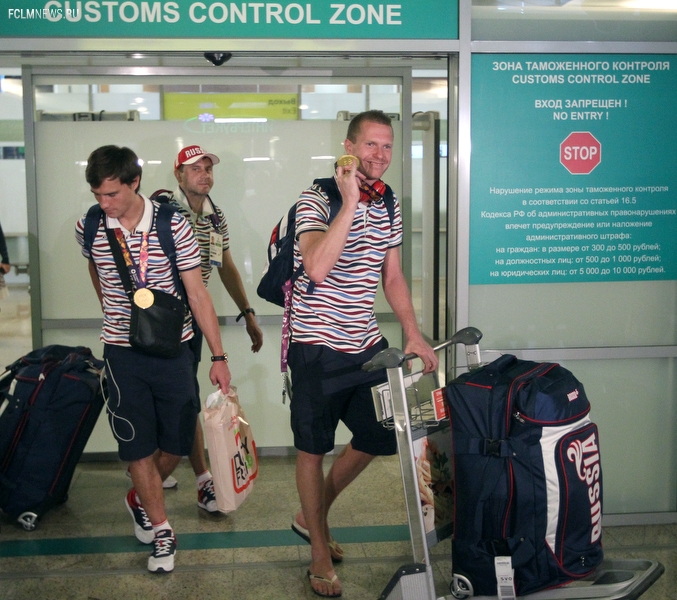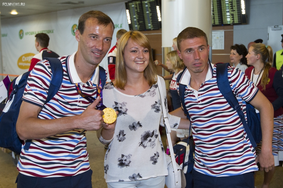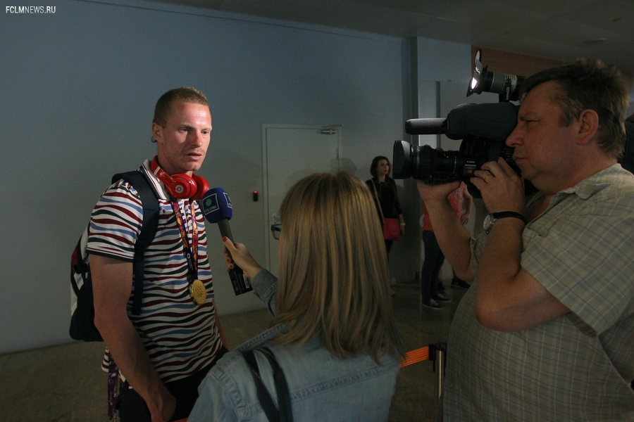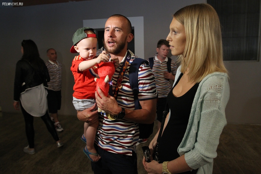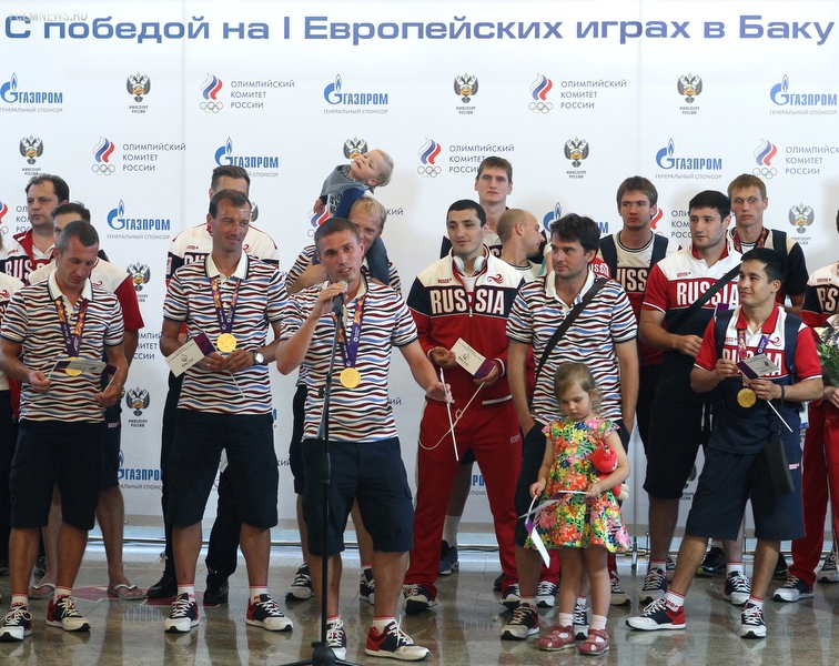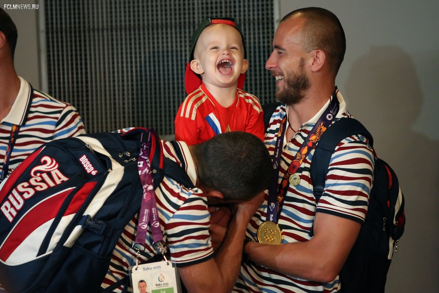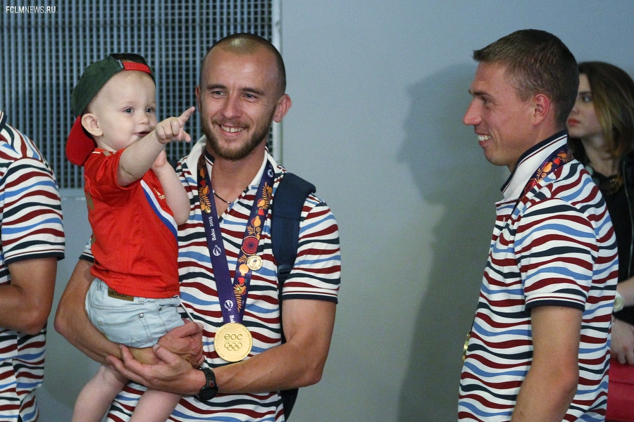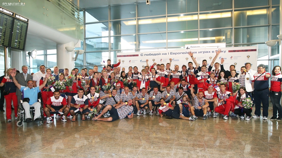 Триумфаторов Европейских игр в аэропорту «Шереметьево» с нетерпением ожидали родственники и болельщики. В торжественной встрече золотых медалистов приняли участие президент ОКР Александр Жуков и заместитель министра спорта РФ Павел Колобков. Футболистов, тренерский штаб и персонал команды поздравили с замечательным достижением и вручили букеты цветов. Тепло поприветствовали команду также генеральный директор РФС Александр Алаев и спортивный директор РФС Николай Писарев.