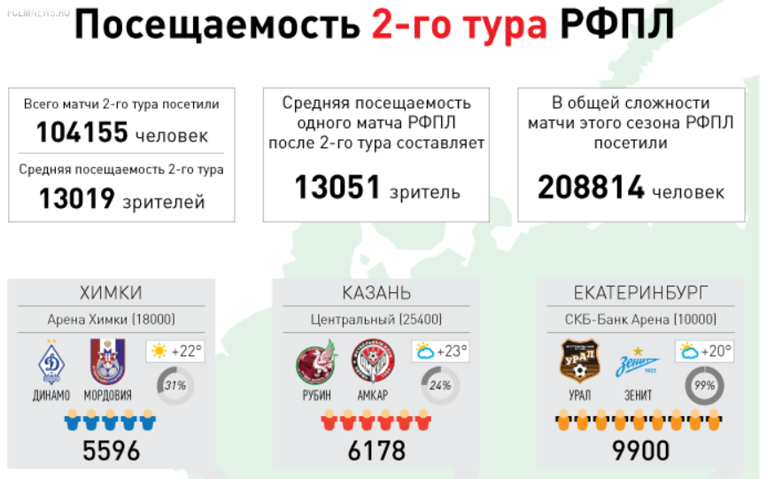 В целом второй тур собрал приличную аудиторию для матчей РФПЛ. По сравнению с первым туром значения почти не упали: 104155 человек (13019 в среднем на одном матче) против 104659 (13082), что даёт лишний повод порадоваться и поверить в то, что наш футбол ещё кому-то интересен. Пока идёт лето надо продолжать укреплять задел перед холодными временами года, чтобы падение потом было не таким сильным, как в прошлом сезоне.