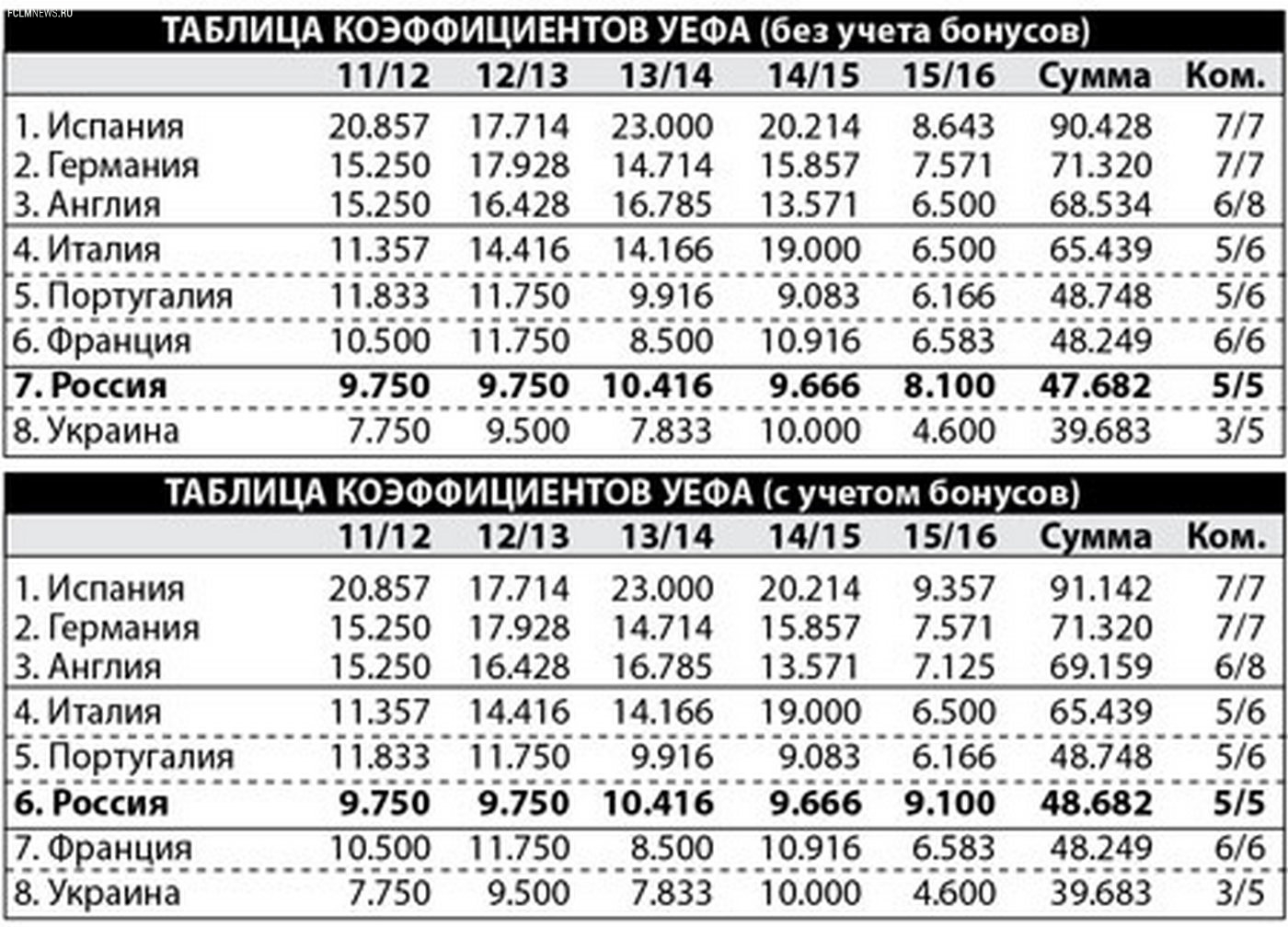 И вот, чтобы минимизировать неизбежную путаницу, мы сегодня публикуем две таблицы коэффициентов УЕФА - с учетом завоеванных бонусов и без них. Пусть каждый выбирает, какая система подсчета ему более удобна. А так как в таблице клубных рейтингов ситуация яснее, мы не стали лепить еще одну громоздкую конструкцию для того, чтобы отнять 5 очков всего у трех команд («Реала», «МанСити» и «Зенита»).