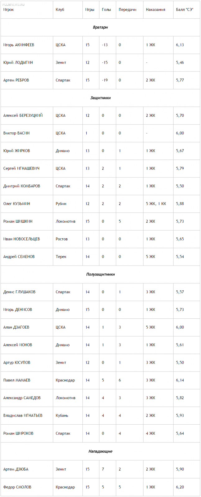"СЭ" собрал статистику игроков сборной России, которые вызваны в национальную команду на товарищеские матчи против Португалии и Хорватии, по итогам первого круга премьер-лиги. Лучший средний балл по оценкам "СЭ" среди них имеет нападающий "Краснодара" Федор Смолов. Четыре футболиста – Игорь Акинфеев, Артем Ребров, Роман Шишкин и Игорь Денисов провели в премьер-лиге по 15 матчей без замен.