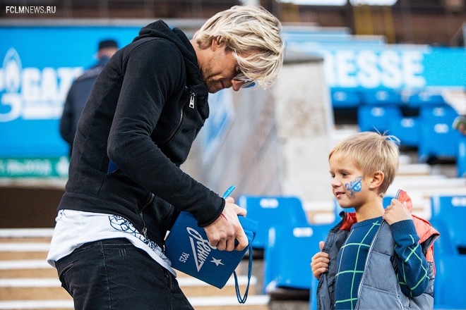 Другой известный зритель на стадионе «Петровский», Анатолий Тимощук, дал автограф юному фанату. Судя по движению его рук, он хочет ещё одну роспись – на себе.
