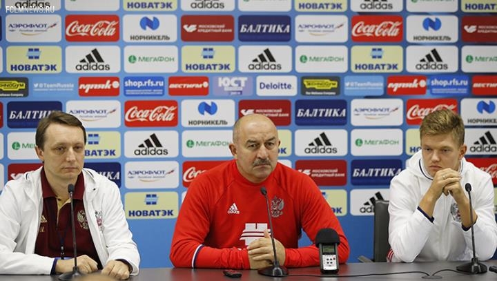А перед этим состоялась пресс-конференция, в которой приняли участие главный тренер сборной России Станислав Черчесов и полузащитник Олег Шатов.
