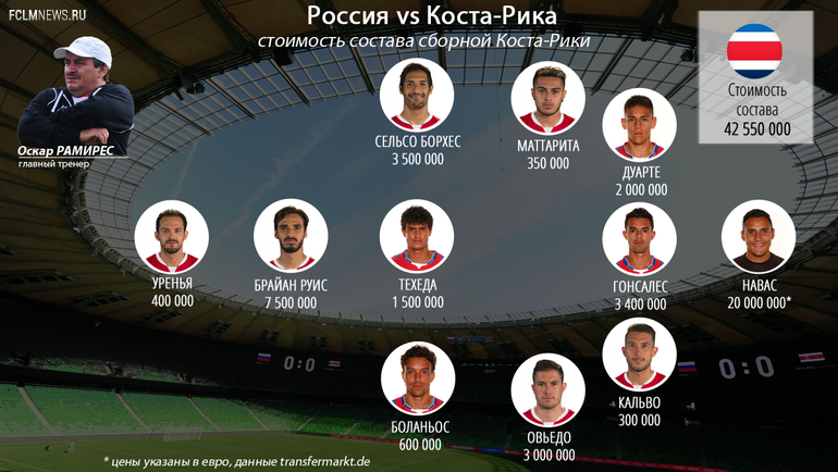 Самым дорогим футболистом у России является полузащитник "Зенита" Олег Шатов (12 миллионов евро), а у костариканцев голкипер "Реала" Кейлор Навас (20 миллионов евро).