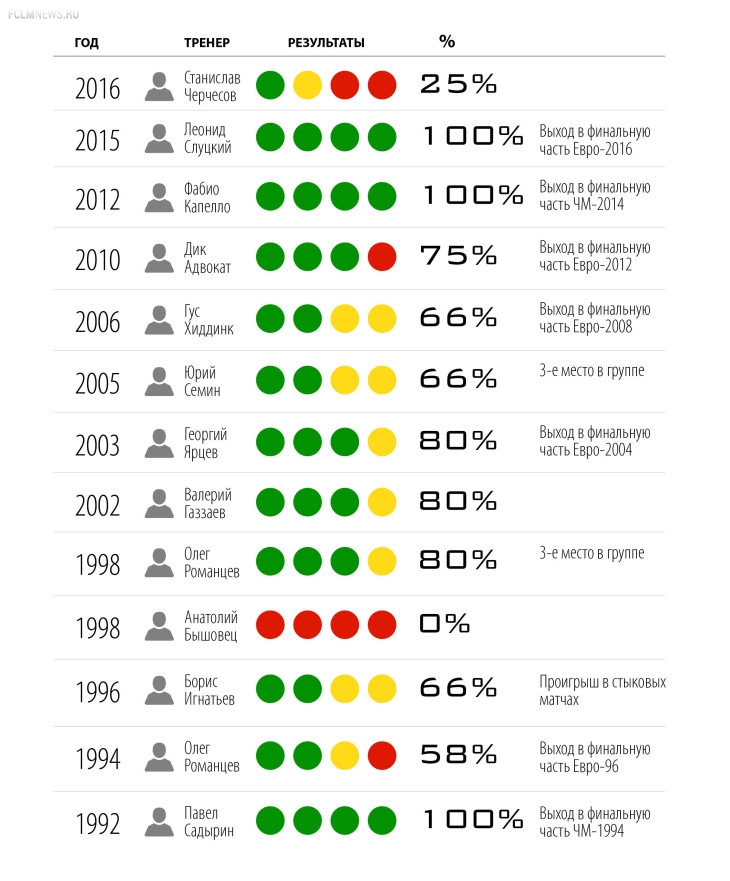 Во время короткого перерыва между провалом в Катаре и игрой против Румынии в Грозном статистики «Советского спорта» поднимают архивы, чтобы сравнить – насколько успешно начинали на своем посту бывшие главные тренеры сборной России. Оказалось, что у Станислава Черчесова один из худших в истории показателей: в первых четырех матчах под его руководством сборная выиграла лишь однажды, еще раз сыграла вничью, а два матча проиграла. Хуже него в сборной России начинал только Анатолий Бышовец, который проиграл шесть матчей из шести. Справедливости ради следует отметить, что команда Бышовца проигрывала соперникам более серьезным, чем Катар – действующим чемпионам мира сборной Франции (дома) и сборным Швеции, Украины, Испании, Исландии и Бразилии (в гостях).
