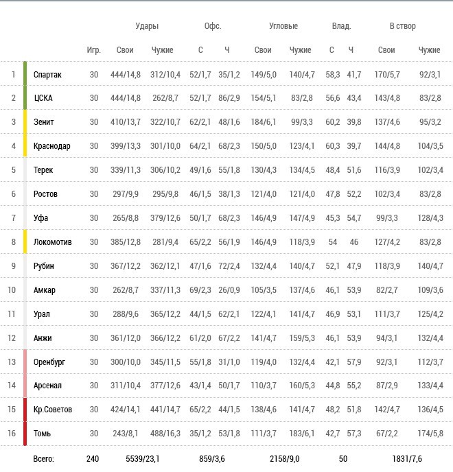 По чужим воротам: максимум – «Спартак» и «Зенит» ( по 444; 14,8), минимум – «Томь» (243; 8,1).