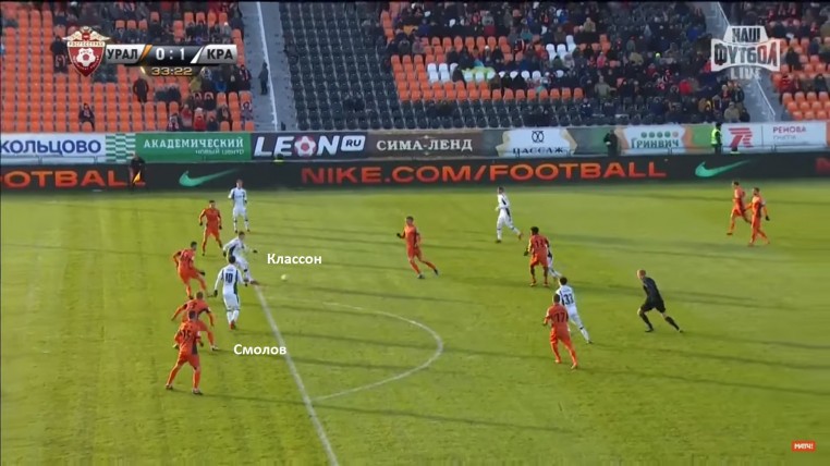 «Краснодар» использует схему 4-2-3-1. Классон в ней номинально играет левого полузащитника. Но в стадии позиционных атак становится вторым нападающим - открывается в линии защитников прямо перед воротами. Наличие на левой бровке Рамиреса и Мамаева с Перейрой в диспетчерской зоне позволяют так делать.
