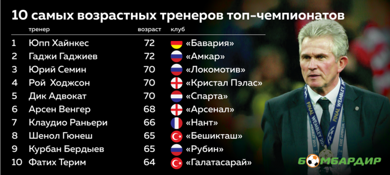 Самым возрастным тренером в топовых европейских лигах является главный тренер «Баварии» Юпп Хайнкес (72 года). Компанию ему в тройке составили наши Гаджи Гаджиев и Юрий Семин. Примечательно в этой десятке сразу три представителя российского чемпионата.