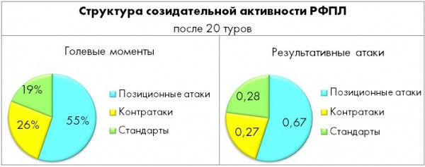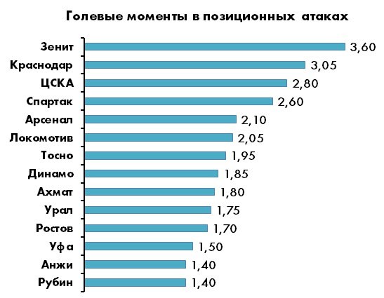 Созидательная активность в позиционных атаках достаточно четко коррелирует с процентом владения, который у квартета лидеров выше, чем у остальных. Слегка не в тренде только «Локомотив», но в общем-то не секрет, что проблемы у банды Сёмина по большей части возникали в матчах с андердогами (как следствие – поражения от «Тосно», «Амкара» и «Уфы»), где фирменная выжидательная модель была не применима. Усредненный показатель лиги без учета Перми и Хабаровска – 2,11 моментов за игру, так что лидер чемпионата в этом компоненте пока сильно ближе к середнякам. У «Зенита» и «Краснодара» проблемы несколько иного толка - и тем, и другим нужно срочно подтягивать позиционную эффективность, которая пока никуда не годится (в первую очередь, из-за векторной предсказуемости).