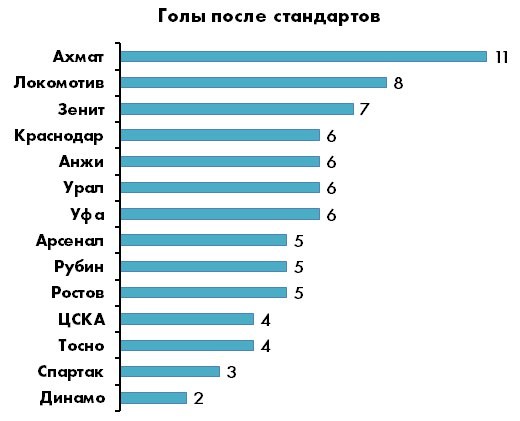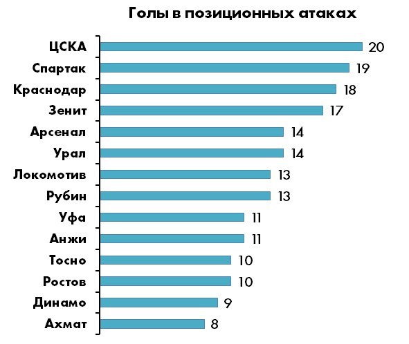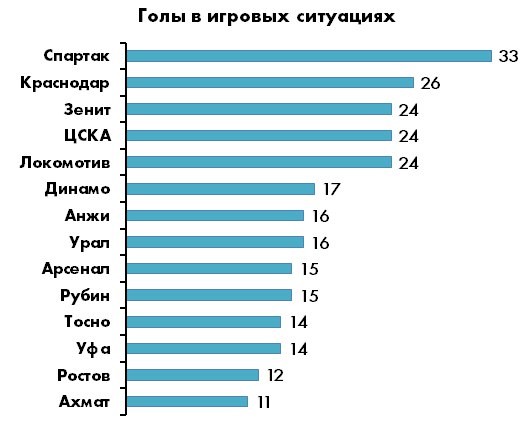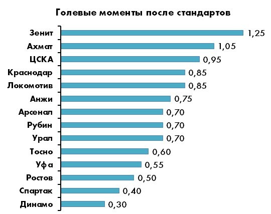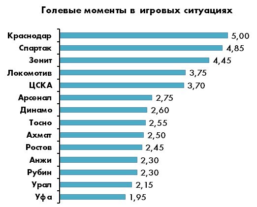 Расстояние между 5-й и 6-й строчкой больше, чем между 6-й и 14-й – логичный отголосок все того же классового расслоения. Лучшая команда по «нестандартным» голам во втором эшелоне – достаточно неожиданно – столичное «Динамо» (17), тогда как у «Ахмат» после игровых комбинаций забивает реже остальных. Доля голевых моментов в игровых ситуациях у среднестатистической команды РФПЛ составляет около 80%, причем острые ситуации «в позиционке» возникают в два с лишним раза чаще, чем в атаках на скорости.