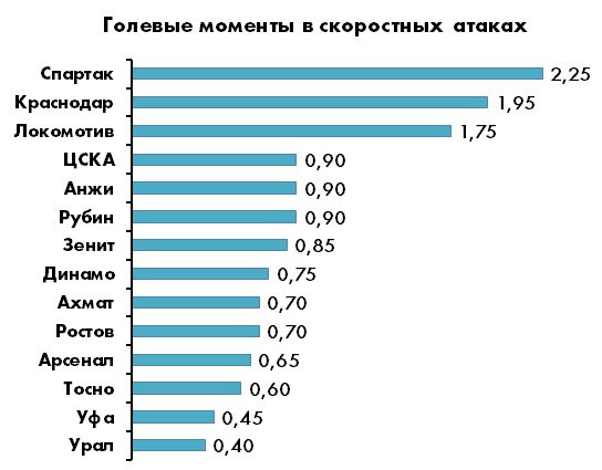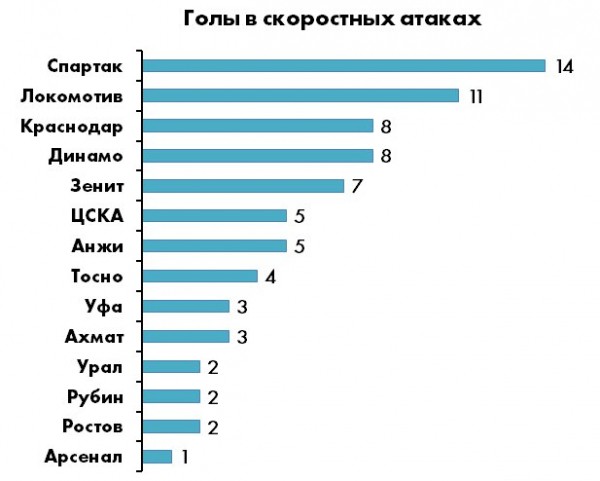 Скорость и пространство лучше других используют «Спартак», «Краснодар» и «Локо», причем между этим трио и всеми остальными – целая пропасть. «Зениту» и ЦСКА этот компонент нужно срочно подтягивать – показатели у обоих ниже средневзвешенной нормы (0,98 моментов за игру). Из команд второго эшелона неплохой контратакующий потенциал имеют «Рубин» и «Анжи», но подопечные казанцы его пока совершенно не реализовывают.