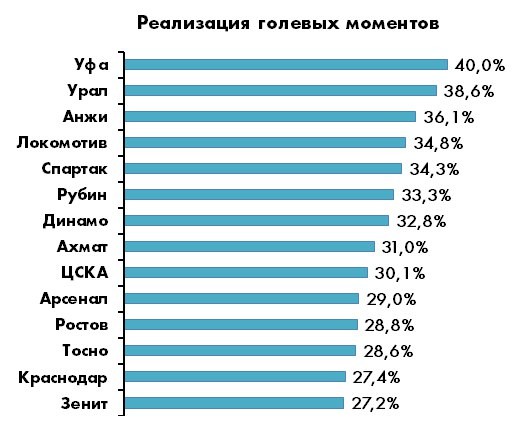 Голевая эффективность – показатель куда более демократичный, здесь формальный статус и клубный бюджет не играет вообще никакой роли. Абсолютный лидер сводного рейтинга – все та же «Уфа», и сходу мне удалось обнаружить два объяснения этому факту. Факт номер один: при всей своей ударной пассивности (см. выше) команда Семака – 4-я в лиге по числу ударов из площади ворот и при этом 16-я по числу ударов, заблокированных соперниками. Делаю вывод, что Сергей Богданович как перфекционист требует от команды избегать тех самых «мусорных» ударов и по возможности доводить ситуации «до верного». Факт номер два: «Уфа» - единственная команда РФПЛ, которая за 20 туров ни разу не попала в штангу. Усредненная эффективность по всем 14 командам составила 31,4% - и это тот ориентир, который можно считать условной нормой для контекстной расчетной модели. Т.е. при значительном отклонении от этой нормы «в плюс» можно прогнозировать снижение показателя в долгосрочной перспективе (а значит и вероятное падение результативности), а при отклонении «в плюс» - наоборот. И чем больше это статистическое отклонение, тем больше вероятность дальнейшего сглаживания.