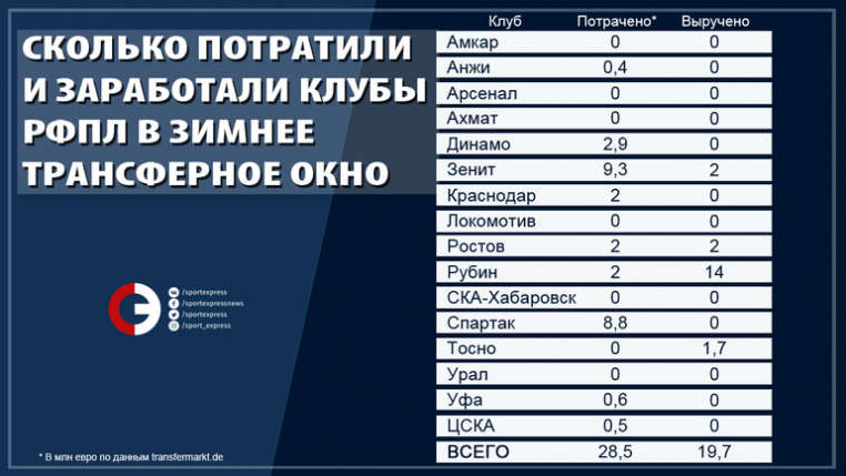 Красно-белые зимой провели два размена: вместо ушедшего в аренду Попова взяли алжирца Ханни из "Андерлехта" (самая дорогая покупка окна – 7 миллионов евро по данным transfermarkt.de), а место травмированного Джикии временно занял Максимович из "Наполи". Но главная история зимы связана с несостоявшимся трансфером. Больше месяца тянулась мыльная опера с переходом в "Спартак" защитника "Сантоса" Лукаса Вериссимо. Сначала выяснилось, что от имени футболиста с прессой общается совсем не его агент, затем "Сантос" прикрыл переговоры, потом снова возобновил и якобы договорился со "Спартаком". В Москву даже приехали представители игрока, но на месте выяснилось, что они общались совсем не с людьми из клуба, и ни с чем улетели обратно в Бразилию. Занавес.