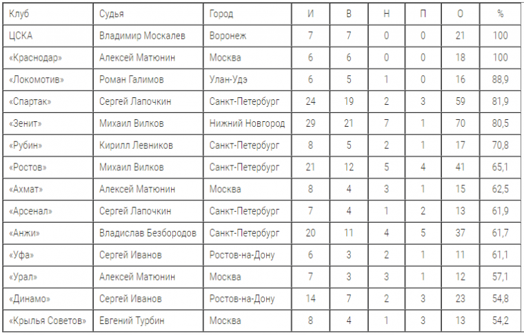 Оказалось, что есть сразу два арбитра, которые «обеспечивают» своим «любимым» командам стопроцентный результат: при судействе Владимира Москалева московский ЦСКА выиграл 7 матчей из 7, а при работе Алексея Матюнина 6 раз из 6 побеждал «Краснодар».