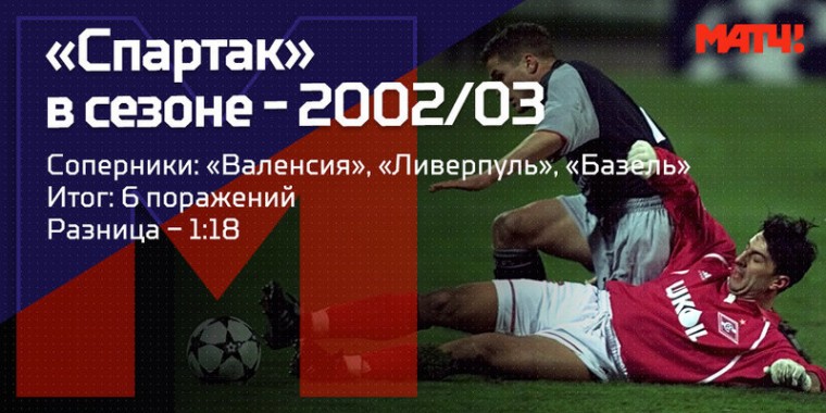 Закат золотой эпохи «Спартака». Шокирующее десятое место в чемпионате по итогам 2003 года и жуткое выступление в Европе. Результат команды Романцева в Лиге чемпионов стал антирекордом турнира на следующее 9 лет. В 2011 хуже выступило загребское «Динамо» (0 побед, разница – 3:22).